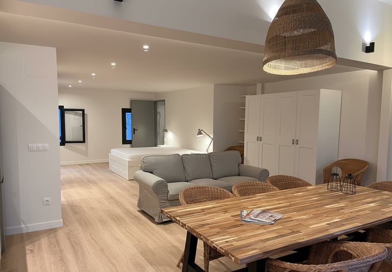 Reforma completa de un espacio antiguo convertido en un loft moderno, amplio y bien distribuido, con terraza acogedora.